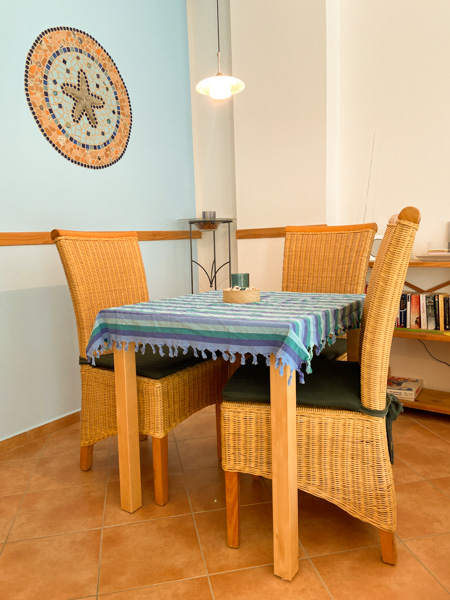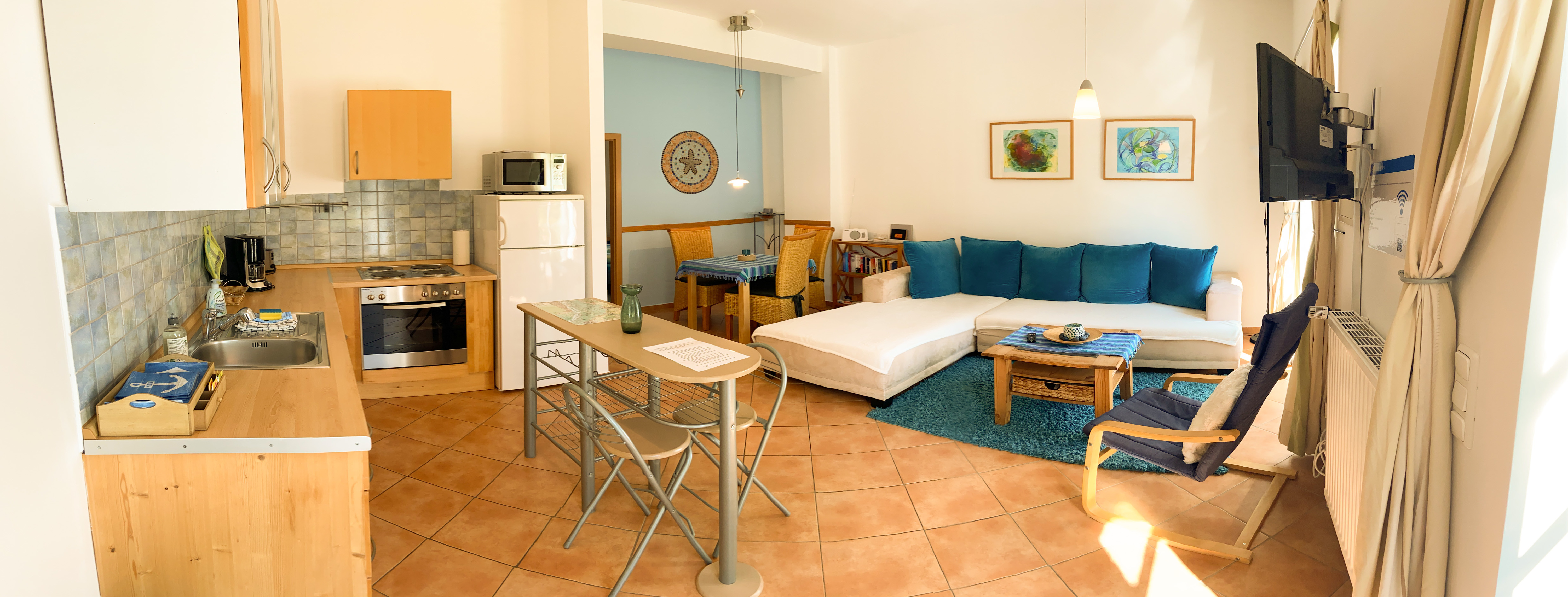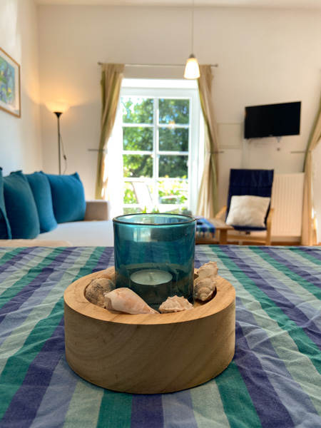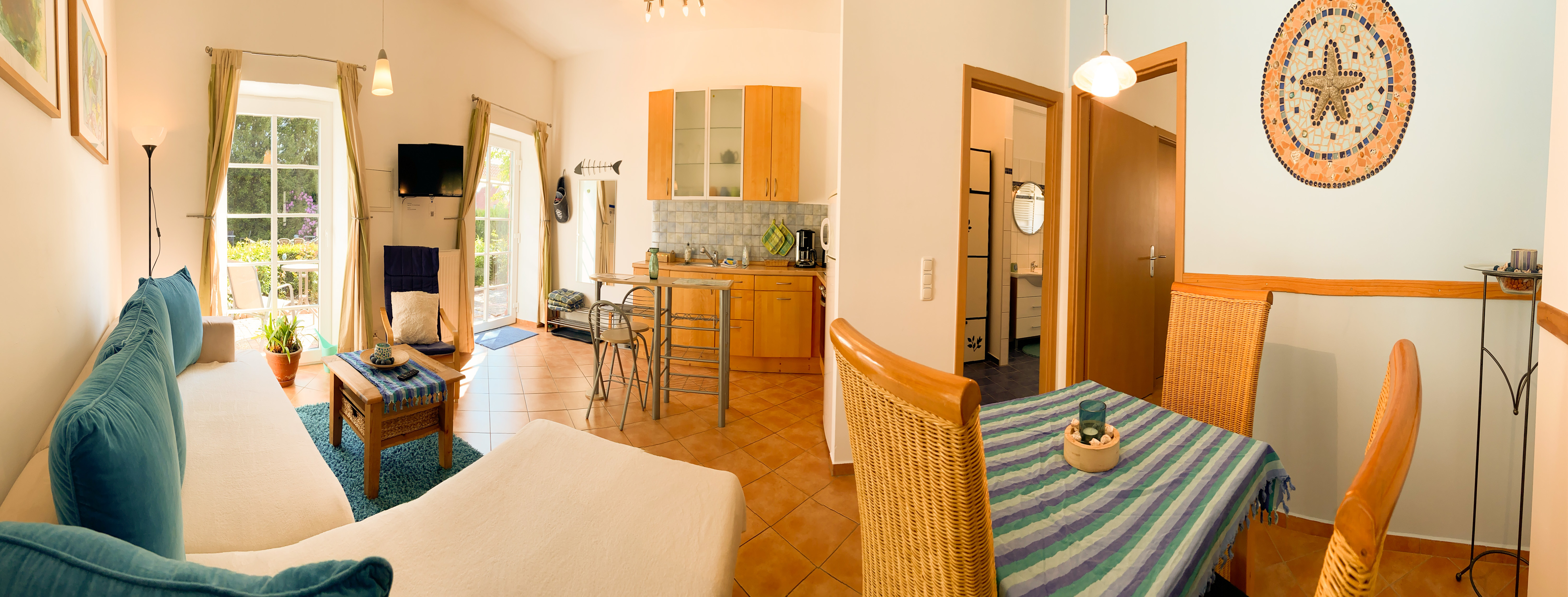 Die Ferienwohnung "Herbstprinz" ist in Blau- und Grüntönen gestaltet. Sie befindet sich, wie auch Ferienwohnung 4 und 5, in einem 100-jährigen, komplett neu renovierten Haus, welches 2010 fertiggestellt wurde. Die schöne Einrichtung und eine nette Terrasse laden zum Entspannen ein. Das großzügige Badezimmer und der wunderschöne Wohn- und Essbereich sind die Highlights dieser Wohnung.| Größe: 40m² | Zimmeranzahl: 3 | Maximale Belegung: 3 |